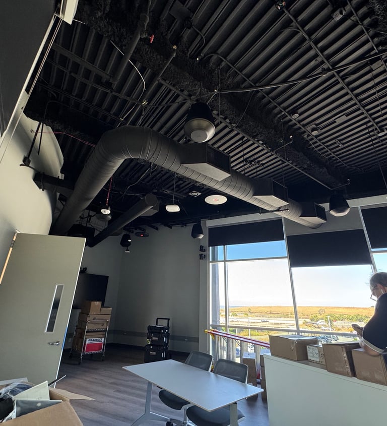 The silver pipe hangars got a couple coats of black spray paint. The areas where insulation was scraped from the beams were also sprayed. With the lights in, the hardware disappears.